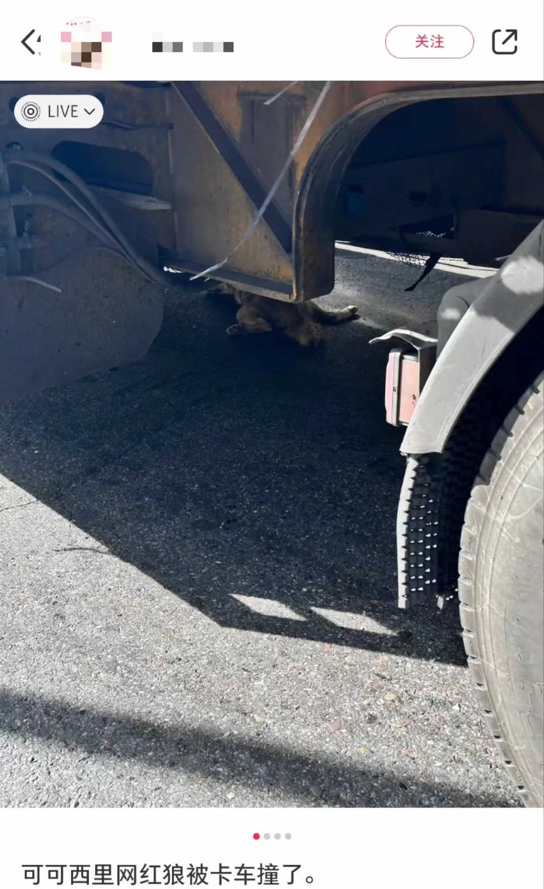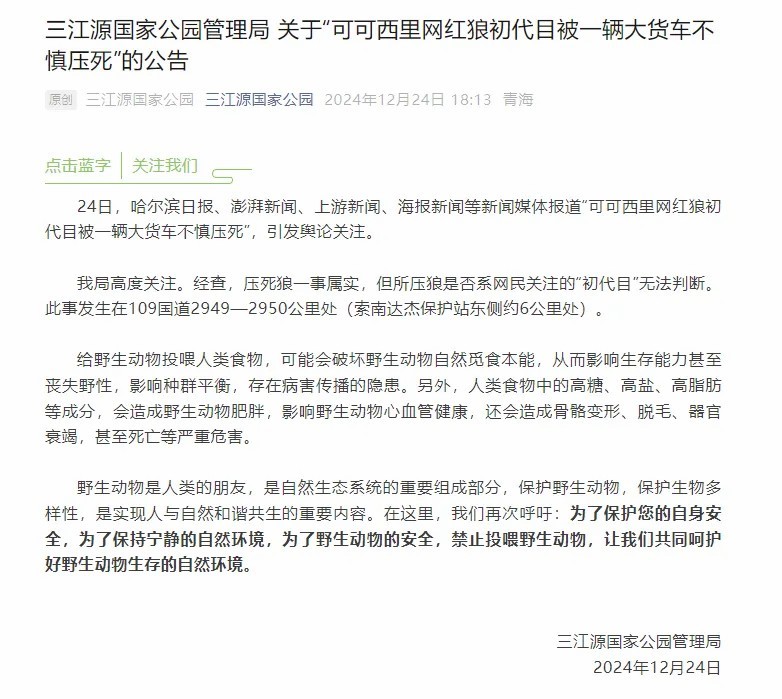 三江源國(guó)家公園管理局工作人員表示,目前在公路等待游客投喂的狼有四五只,被軋死的為其中一只,當(dāng)時(shí)大貨車司機(jī)發(fā)現(xiàn)狼后緊急剎車,但是已經(jīng)來(lái)不及。