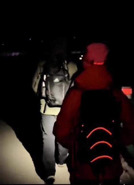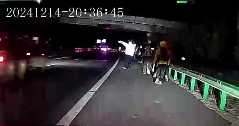 在高速交警的帶領下,一場特殊的“高速徒步”就此展開。夜色中警燈閃爍,乘客們排成一條長隊沿著路肩行走,郝鵬飛在隊伍前面倒退著走,隨時指揮過往車輛注意避讓,其余民警有的在乘客邊護衛,有的駕駛警車在隊伍后方跟隨預警。