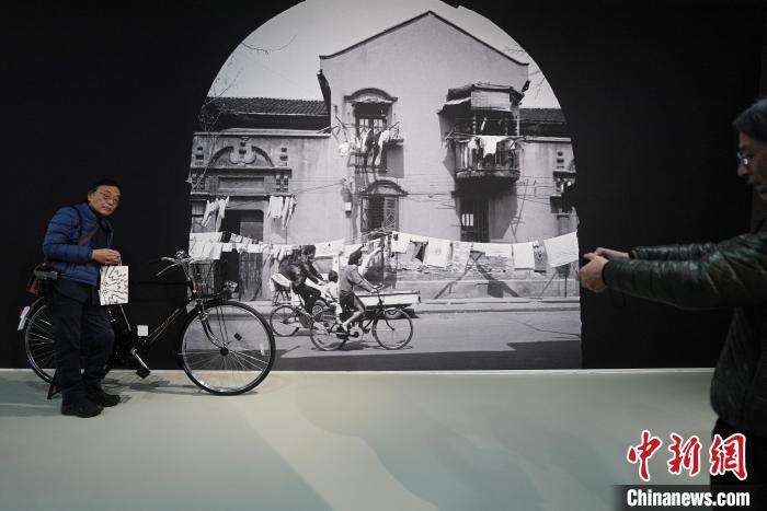 現場嘉賓在攝影家郭博的影像作品“石庫門弄堂”場景前留影。中新網記者 張亨偉 攝