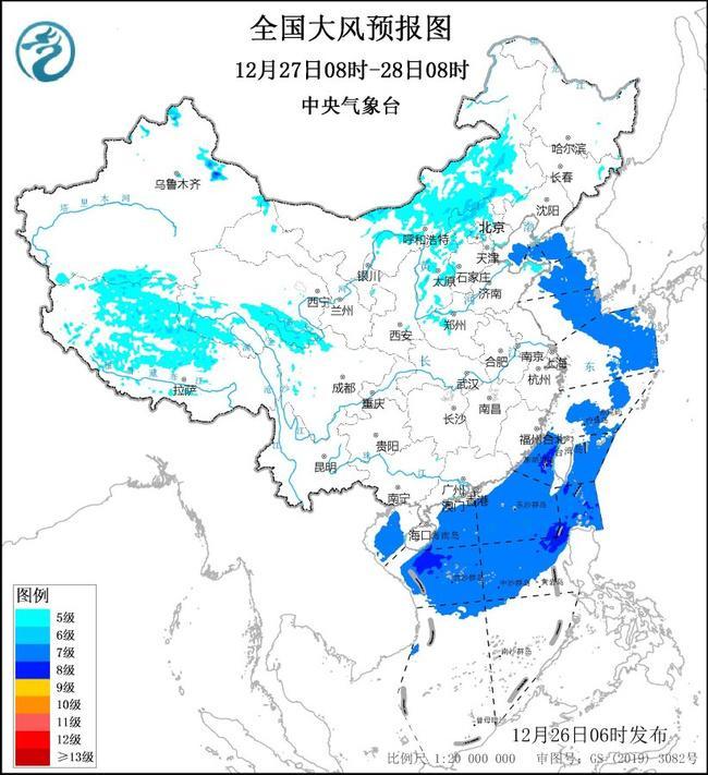12月27日08時至28日08時,西藏中北部、青海南部、內蒙古中東部、山西、河北北部、山東半島等地部分地區有5~6級風、陣風7~8級;渤海南部、渤海海峽、黃海大部海域、東海東部和南部海域、臺灣海峽、臺灣以東洋面、巴士海峽、南海北部和中部海域、北部灣將有7~8級、陣風9~10級的大風。