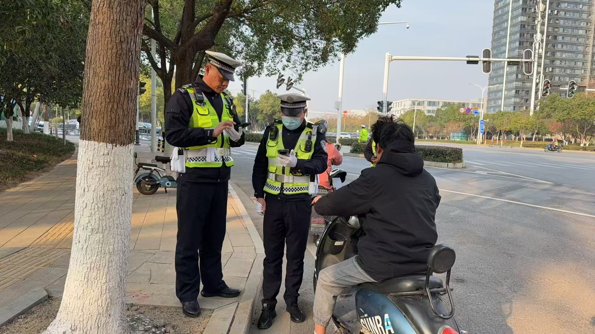 12月24日上午,江夏區交通大隊二中隊在鳳凰山至二道口路段以流動巡邏、固定檢查相結合的方式,嚴肅查糾電動自行車不按車道行駛、逆向行駛、闖紅燈、違法載人、不戴安全頭盔、亂停亂放等各類交通違法行為,全力預防和減少電動自行車交通事故,保障轄區道路安全暢通。