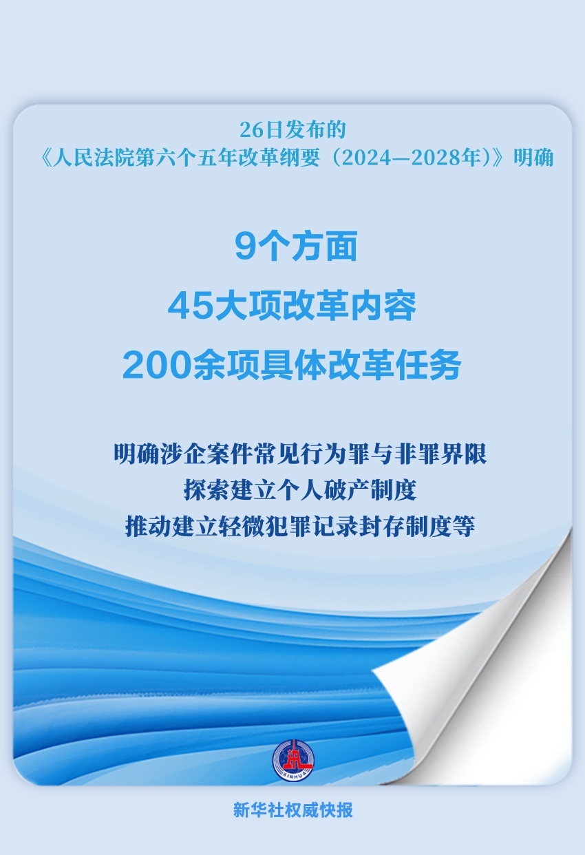 最高人民法院12月26日發(fā)布《人民法院第六個(gè)五年改革綱要(2024—2028年)》,科學(xué)系統(tǒng)謀劃未來一個(gè)時(shí)期人民法院司法改革工作,健全公正司法體制機(jī)制,加快建設(shè)公正高效權(quán)威的社會主義司法制度。