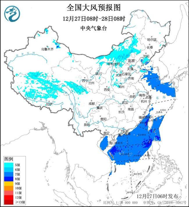 預(yù)計(jì),12月27日08時(shí)至28日08時(shí),內(nèi)蒙古中部、寧夏、山西、河北北部、北京西部、天津、新疆沿天山地區(qū)、青海南部、西藏中北部、遼東半島、山東半島等地部分地區(qū)有5~6級(jí)風(fēng)、陣風(fēng)7~8級(jí),其中,河北北部、西藏中北部等地局地陣風(fēng)9級(jí);渤海、渤海海峽、黃海大部海域、東海北部海域、臺(tái)灣海峽、臺(tái)灣以東洋面、巴士海峽、南海大部海域、北部灣將有7~8級(jí)、陣風(fēng)9~10級(jí)的大風(fēng)。