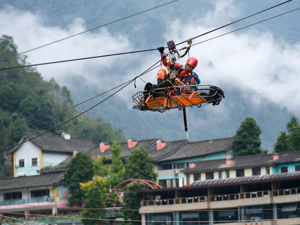 在成都舉行的一場救援技術交流賽中,救援人員參加“長空飛渡”課目比賽(10月17日攝)。