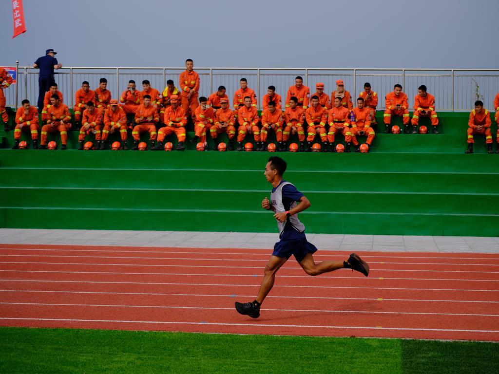 在四川省森林消防總隊舉行的“火焰藍”訓練尖子創破紀錄比武中,一名消防員參加5000米比武競賽(9月23日攝)。