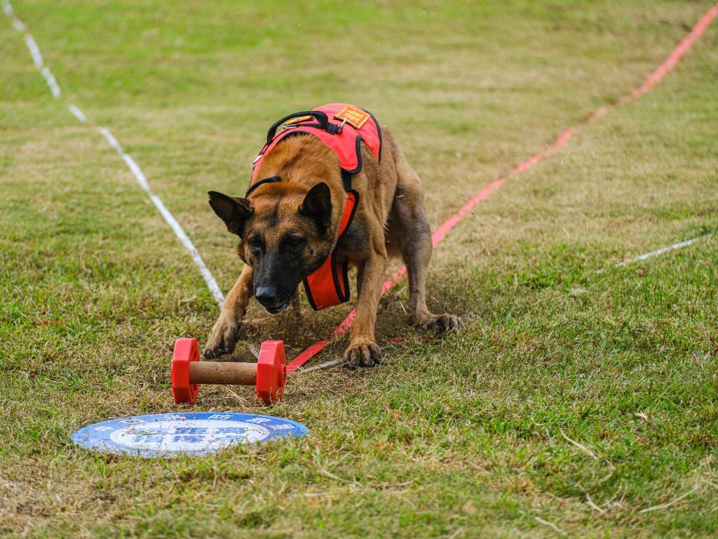 在四川省森林消防總隊舉行的搜救犬技術比武競賽中,一只搜救犬在指揮服從比武中進行啞鈴銜取競賽(9月24日攝)。