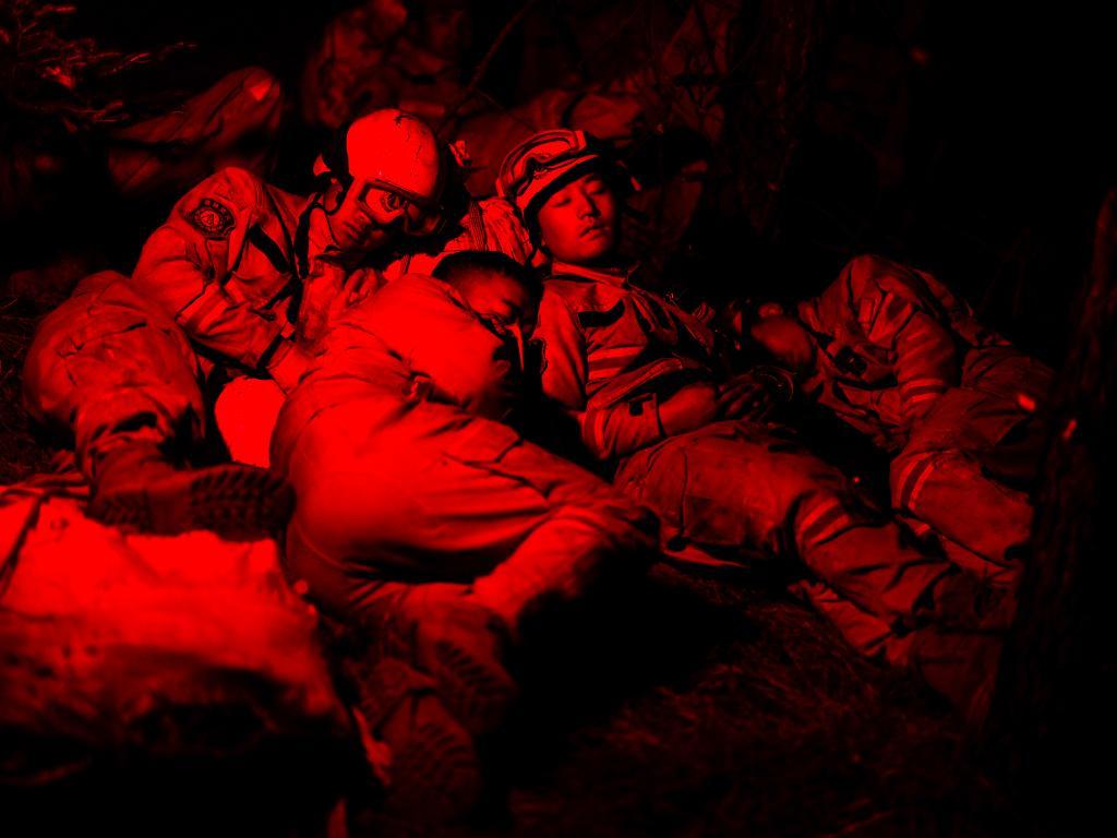 在雅江2號火場,消防員在滅火間隙短暫休息(3月23日攝)。