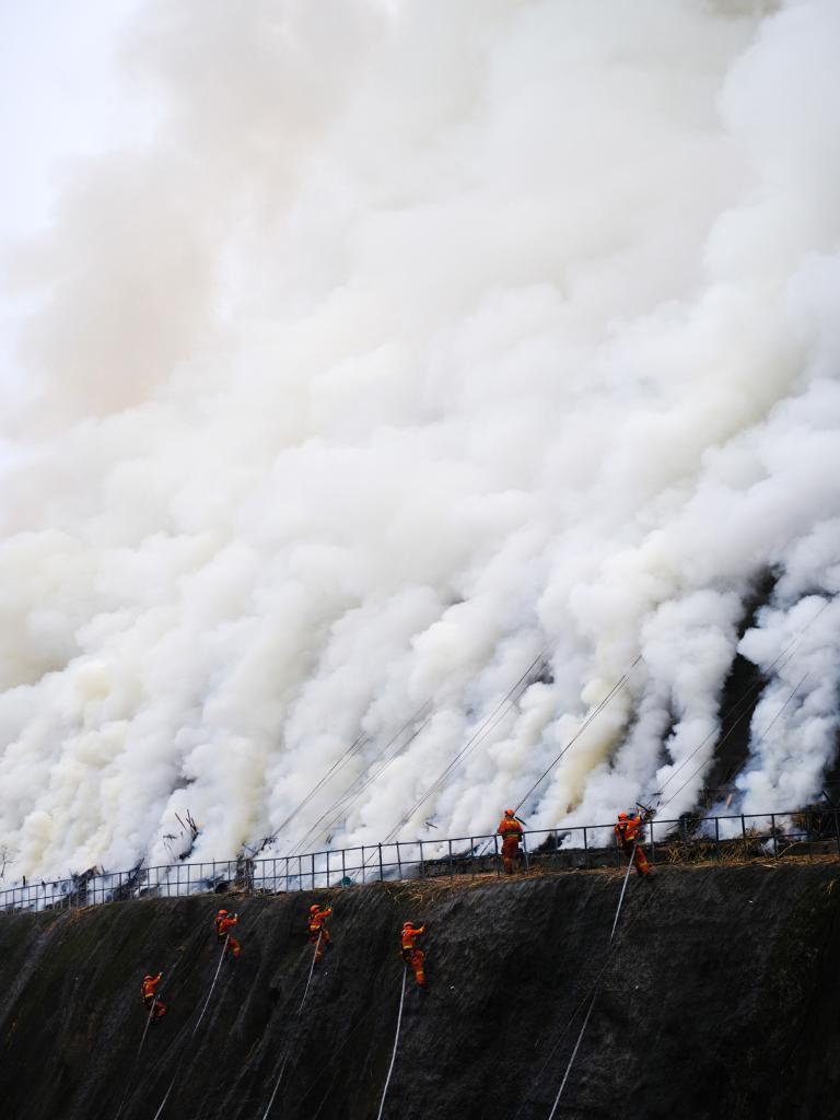 在四川省達州市宣漢縣林區舉行的川渝地區森林火災聯合應急演練中,四川省森林消防總隊特勤大隊消防員利用繩索系統攀登懸崖,架設水泵滅火(1月15日攝)。