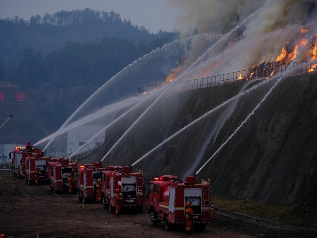 在四川省達州市宣漢縣林區舉行的川渝地區森林火災聯合應急演練中,四川省森林消防總隊特勤大隊進行滅火演練(1月15日攝)。