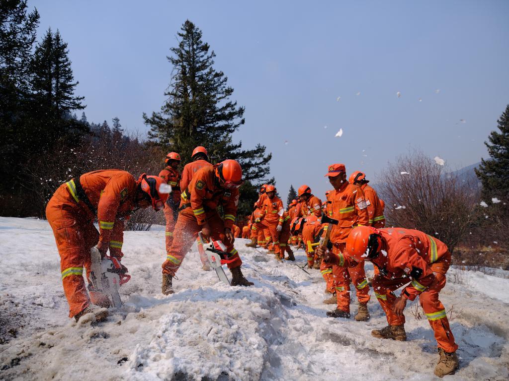 雅江縣2號火場東北線,消防員在八角樓鄉同達村為救援車輛破冰開路(3月17日攝)。