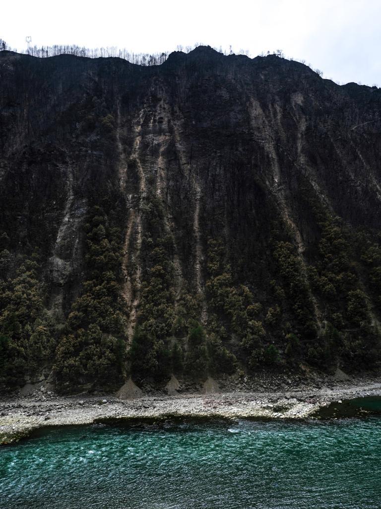 雅江縣雅礱江畔撲滅大火后的山林(3月25日攝)。