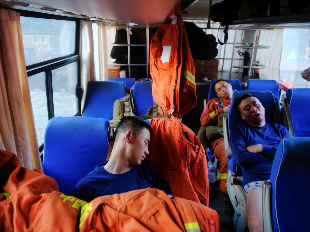 消防員唐陽(左)、劉瑞民(右前)、辛紹楊連夜撲救雅江2號火場南線東段后,回車上休息(3月24日攝)。