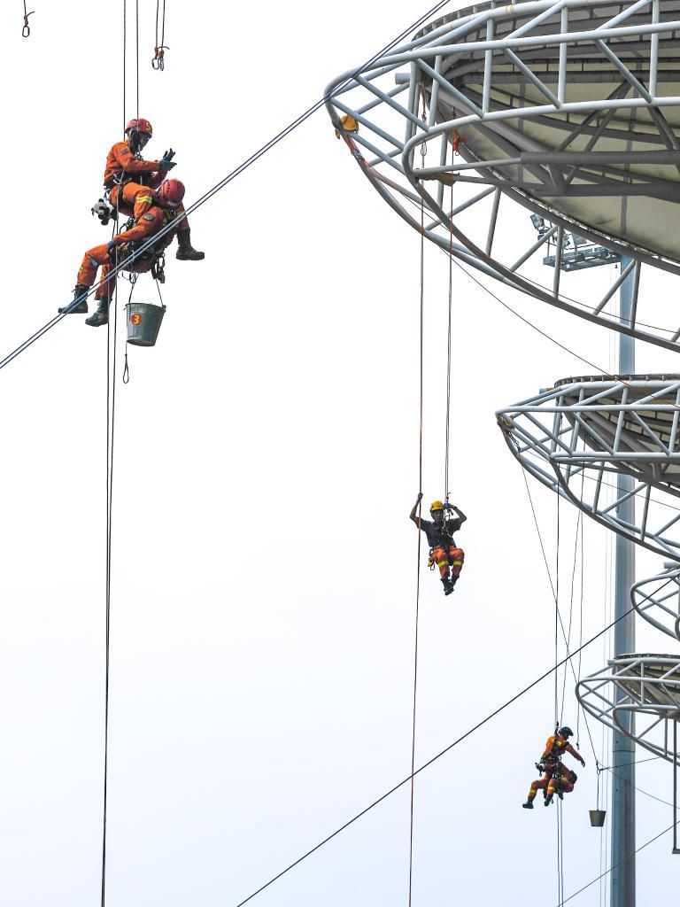 在成都舉行的一場救援技術交流賽中,救援人員參加繩索救援技術比賽(10月15日攝)。