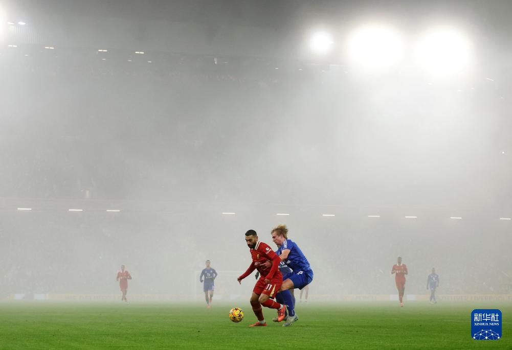 12月26日,利物浦隊球員薩拉赫(左)與萊斯特城隊球員克里斯蒂安森在比賽中拼搶。