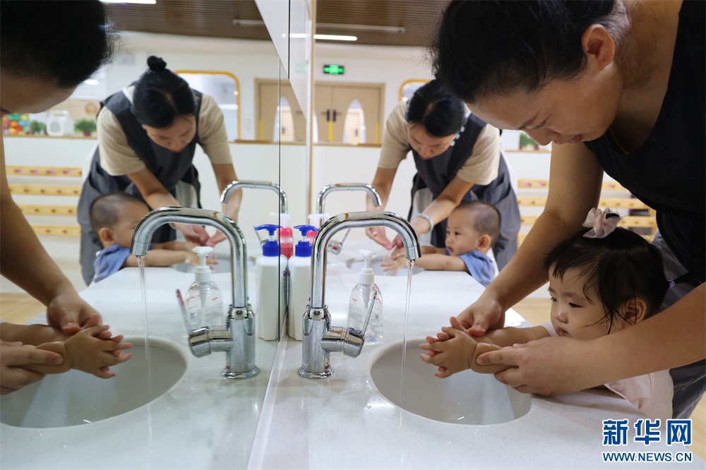 滄州市運河區社區托育園的托育老師為孩子洗手。楊洋 攝