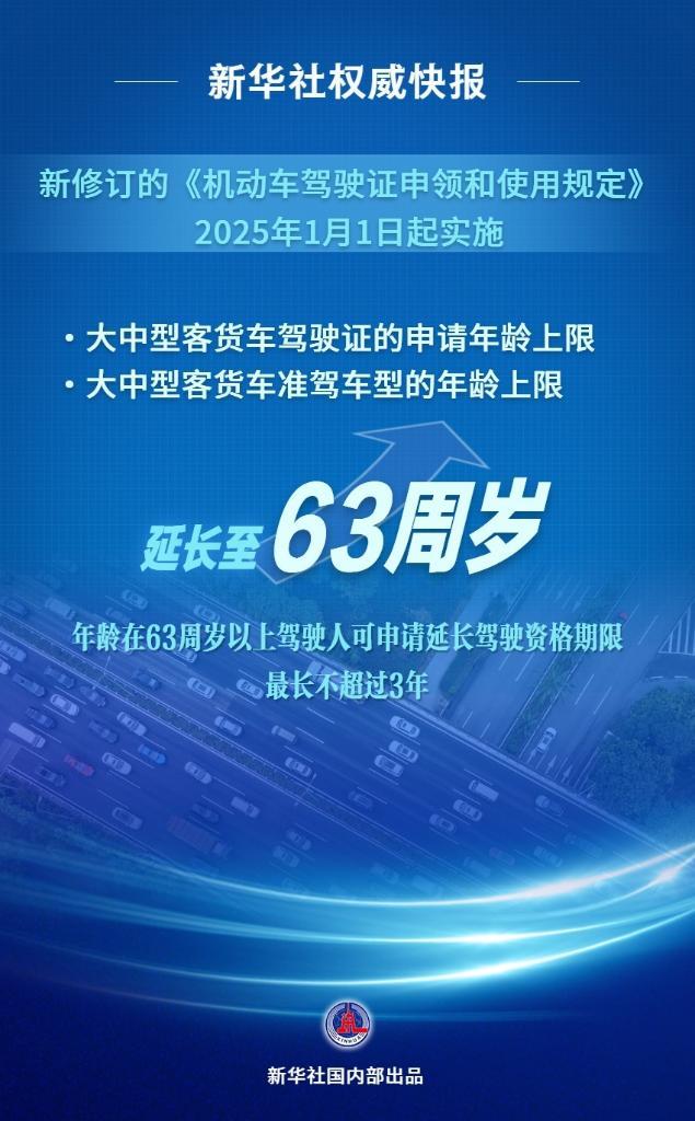 記者12月27日獲悉,公安部近日發布新修訂的《機動車駕駛證申領和使用規定》,將大中型客貨車駕駛證的申請年齡上限由60周歲延長至63周歲,大中型客貨車準駕車型的年齡上限由60周歲延長至63周歲。修訂后的《機動車駕駛證申領和使用規定》將自2025年1月1日起實施。