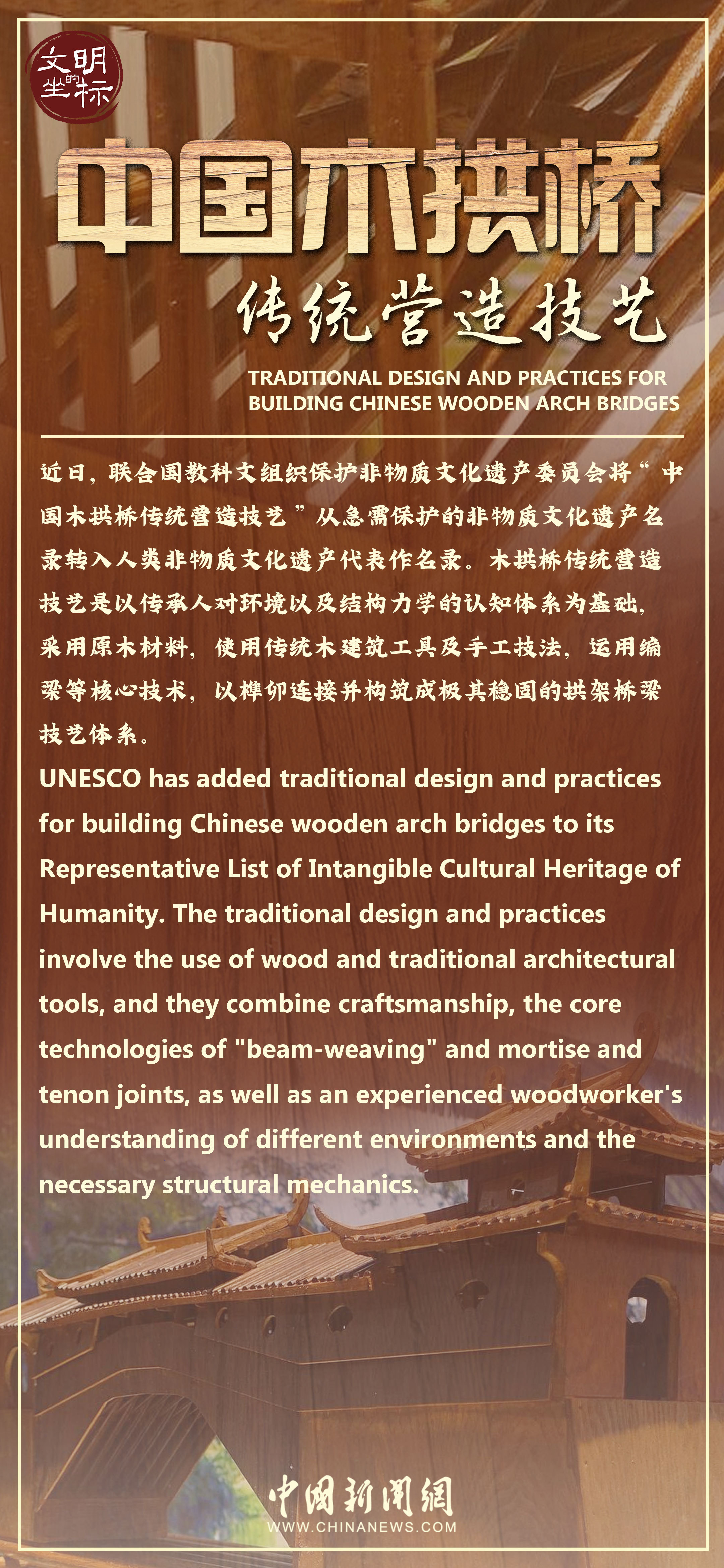 近日,聯合國教科文組織將“中國木拱橋傳統營造技藝”從急需保護的非物質文化遺產名錄轉入人類非物質文化遺產代表作名錄,引發關注。木拱橋是中國傳統木構橋梁中技術含量最高的種類,也是世界橋梁史上獨一無二的門類。因橋上建有遮風避雨的廊屋,又常被稱作“木拱廊橋”。目前,中國保存的木拱廊橋僅約110座,主要分布在福建、浙江兩省交界處。對當地民眾來說,木拱廊橋不僅僅是交通設施,更凝聚著民眾情感和精神世界。廊橋是孩提時蹦蹦跳跳走過的路,是夏日納涼閑話家長里短的涼亭,是鄉民祈愿納福的場所。跨越千年,木拱廊橋串聯起河流兩岸、山里山外,也連接著過去與未來。