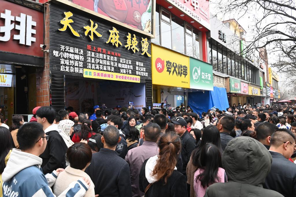 3月16日,在天水市秦州區的天水名優小吃城,游客排隊等待品嘗麻辣燙。(新華社記者 范培珅 攝)