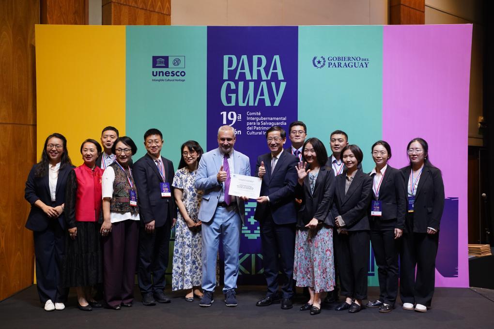 12月5日,在巴拉圭亞松森舉行的聯合國教科文組織保護非物質文化遺產政府間委員會第19屆常會現場,中國代表上臺領取證書。(新華社記者 朱雨博 攝)