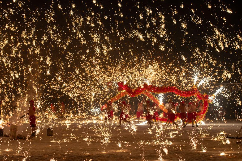 1月29日,在哈爾濱伏爾加莊園,銅梁火龍隊的隊員表演銅梁龍舞。(新華社記者 張濤 攝)