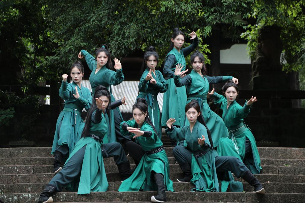 7月2日,“峨眉派女子功夫團”在大廟飛來殿合影。(新華社記者 楊進 攝)