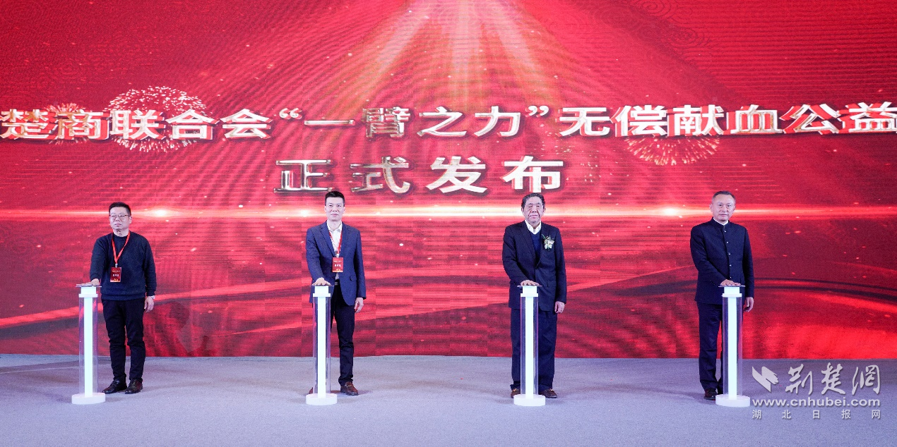 活動中,湖北省楚商聯合會執行會長、九州通醫藥集團名譽董事長劉寶林,湖北省楚商聯合會秘書長蹇宏,湖北省血液管理中心主任楊文波,武漢血液中心黨委書記、主任項征國等共同啟動按鈕,宣布湖北省楚商聯合會2025年“一臂之力”無償獻血公益品牌活動正式啟動。
