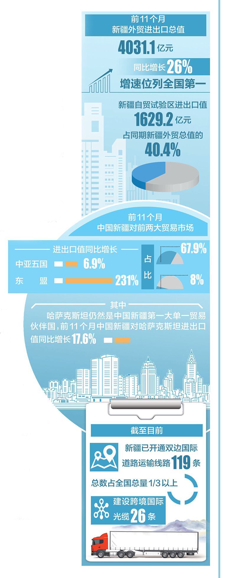 新疆自貿試驗區賦能效應持續顯現。烏魯木齊海關數據顯示,前11個月,新疆自貿試驗區進出口值1629.2億元,占同期新疆外貿總值的40.4%。