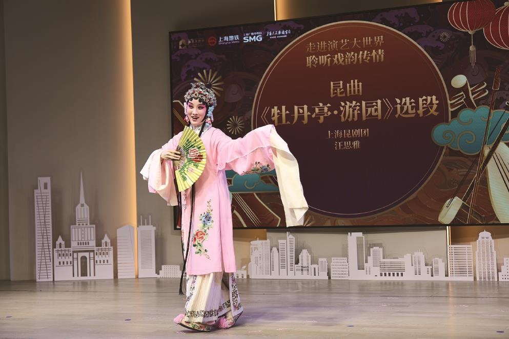 《走進(jìn)演藝大世界,聆聽?wèi)蝽崅髑椤酚卵莩鲎蛱煸诘罔F人民廣場站的公共空間“地鐵音樂角”舉行,邀請市民游客在城市公共空間,邂逅中華傳統(tǒng)藝術(shù),共享文化之美。這場美妙的邂逅時長約60分鐘,演出內(nèi)容豐富多元,囊括京劇《拾玉鐲》《霸王別姬》、昆曲《牡丹亭·游園》、越劇《紅樓夢·讀西廂》、滬劇《探情》、淮劇《白蛇傳·游湖》、評彈《聲聲慢》等膾炙人口的選段。