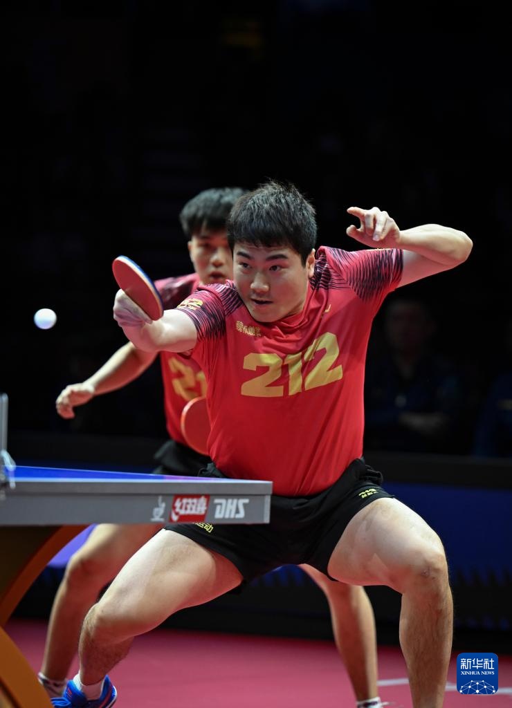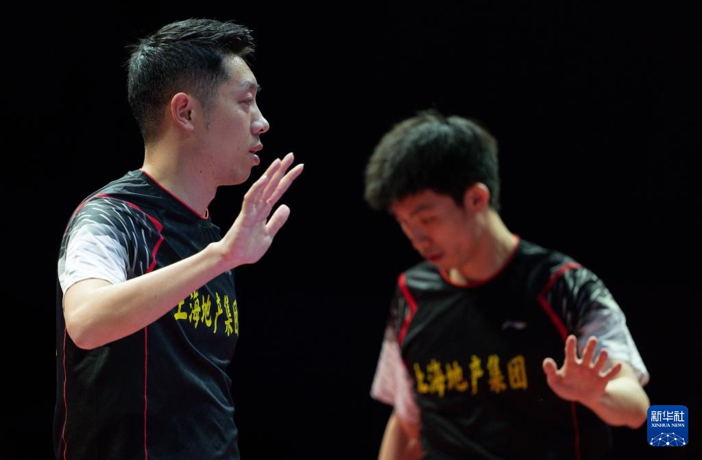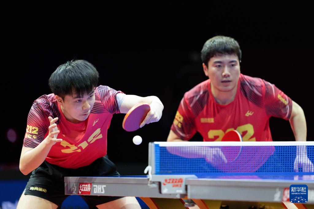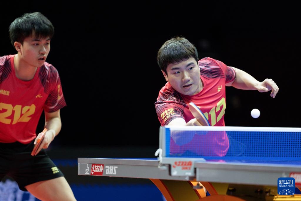 12月31日,山東魏橋·向尚運動隊組合林昀儒/梁靖崑(右)在雙打比賽中。他們3比1戰勝上海地產集團隊組合許昕/周愷。