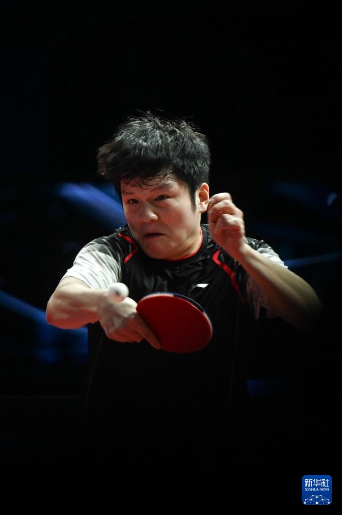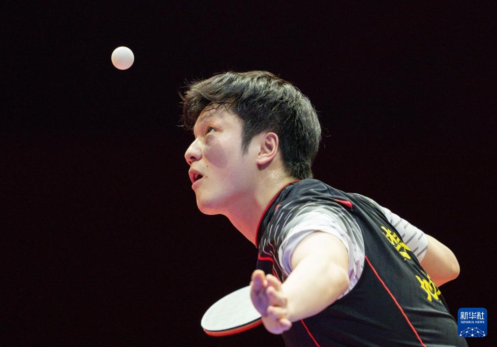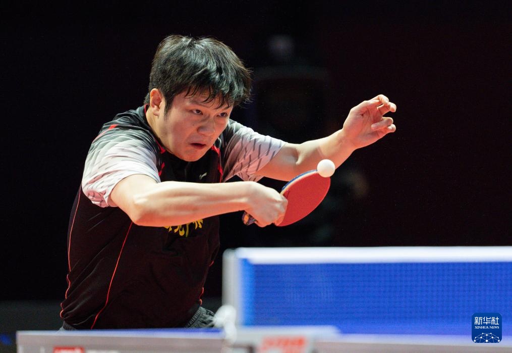 12月31日,上海地產集團隊選手樊振東在單打比賽中發球。他1比3不敵山東魏橋·向尚運動隊選手王楚欽。