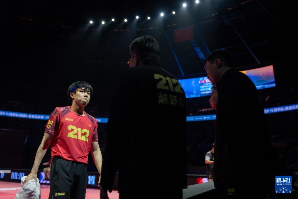 12月31日,山東魏橋·向尚運動隊選手王楚欽(左)在單打比賽間隙接受教練員指導。他3比1戰勝上海地產集團隊選手樊振東。