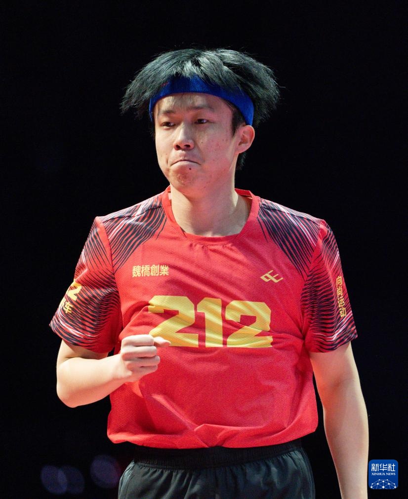 12月31日,山東魏橋·向尚運動隊選手王楚欽在單打比賽中慶祝得分。他3比1戰勝上海地產集團隊選手樊振東。