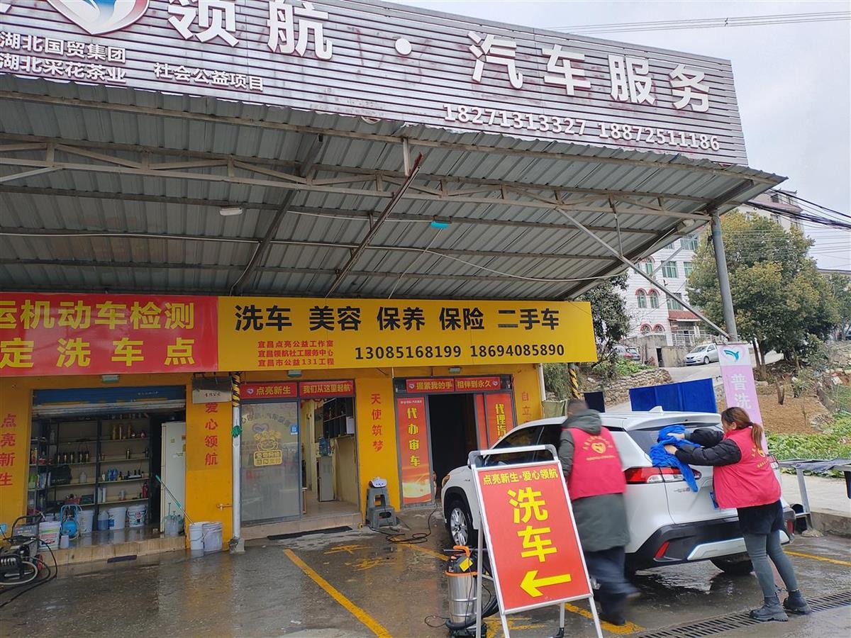 12月24日下午4時30分許,宜昌市夷陵區平云四路,“點亮新生·愛心領航”洗車店,兩名工作人員給一輛汽車噴上泡沫,認真細致地擦拭著。