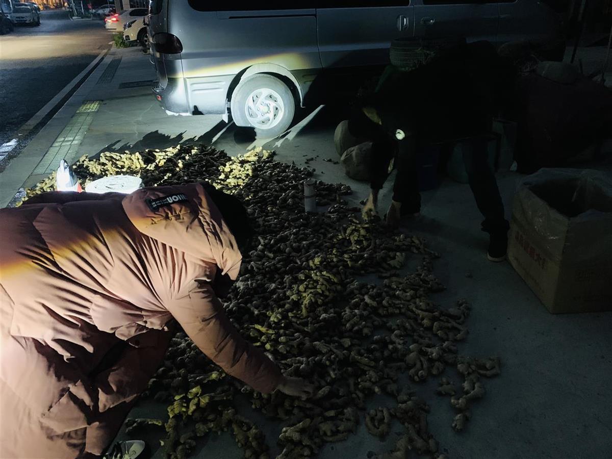 2024年12月24日晚6時4分,天色已黑,向陽仍然守著他的生姜攤,一名女士停在地攤前,彎腰挑著生姜。向陽趕緊打開電動車車燈,幫這位顧客照亮,說:“隨便挑,找好的揀,五塊錢一斤。”