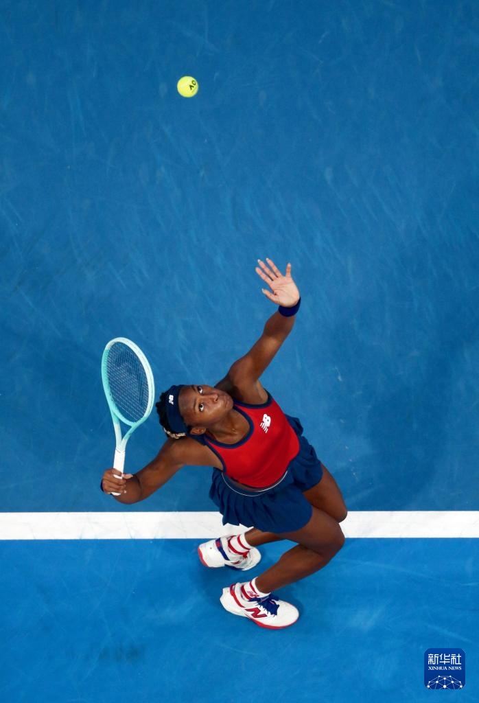 1月1日,美國隊選手高芙(前)在女單比賽中發球。最終,她2比0戰勝中國隊選手張帥。