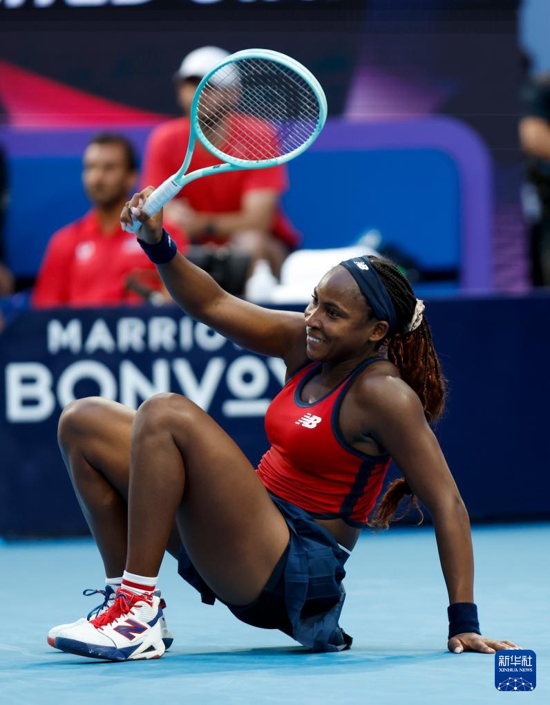 1月1日,美國隊選手高芙在女單比賽后慶祝勝利。最終,她2比0戰勝中國隊選手張帥。