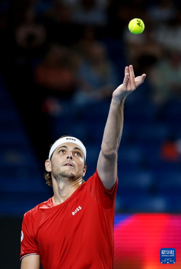 1月1日,美國隊選手弗里茨在男單比賽中發球。最終,他2比0戰勝中國隊選手張之臻。