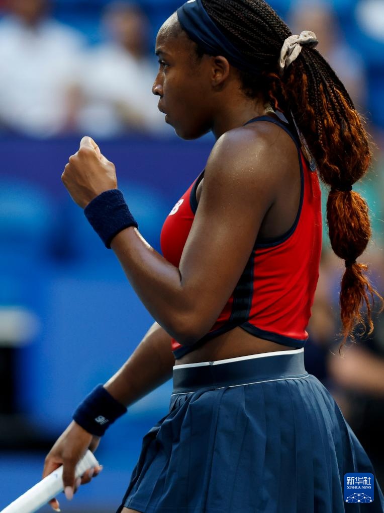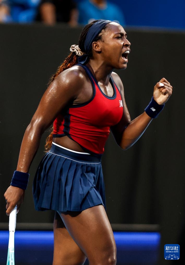 1月1日,美國隊選手高芙在女單比賽中慶祝得分。最終,她2比0戰勝中國隊選手張帥。