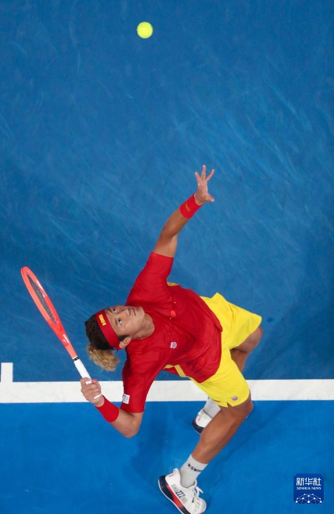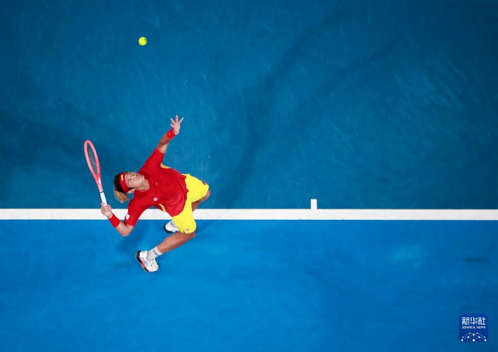 1月1日,中國隊選手張之臻在男單比賽中發球。最終,他0比2不敵美國隊選手弗里茨。