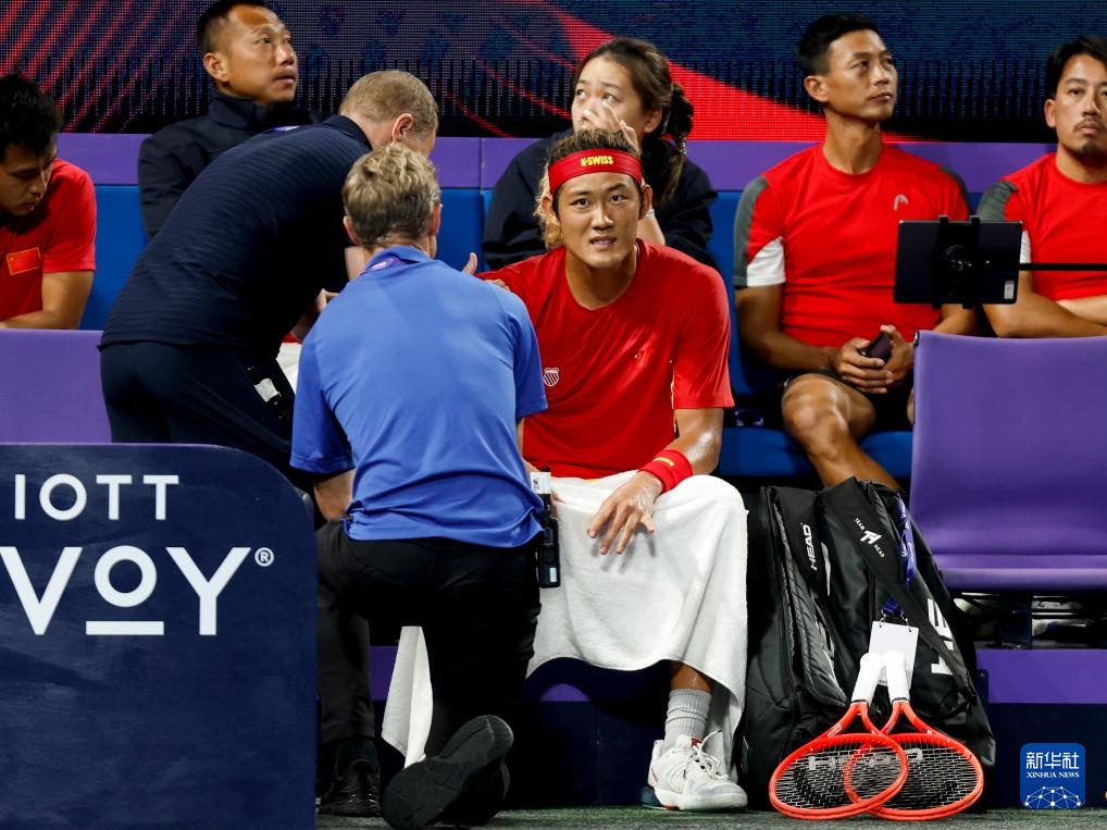 1月1日,中國隊選手張之臻(中)在男單比賽間隙接受治療。最終,他0比2不敵美國隊選手弗里茨。