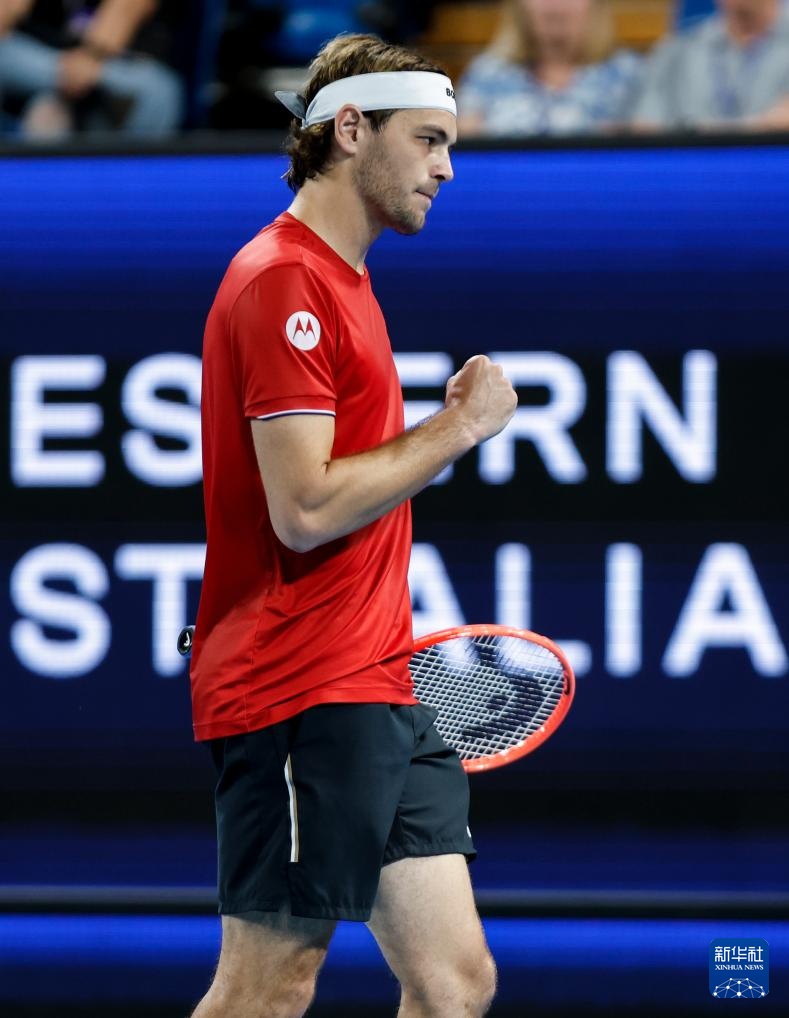 1月1日,美國隊選手弗里茨在男單比賽中慶祝得分。最終,他2比0戰勝中國隊選手張之臻。