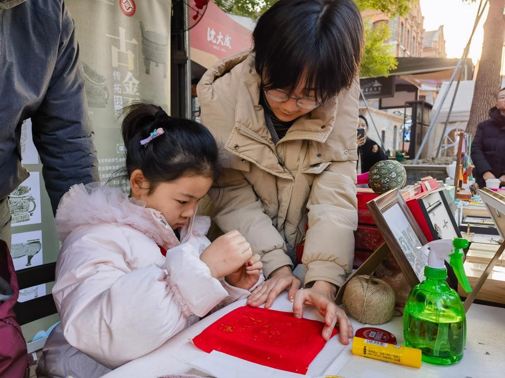 2024年12月31日,金辰怡在“今潮8弄”非遺市集上體驗金石傳拓技藝,制作一幅“路路平安”圖。新華社記者 陳愛平 攝