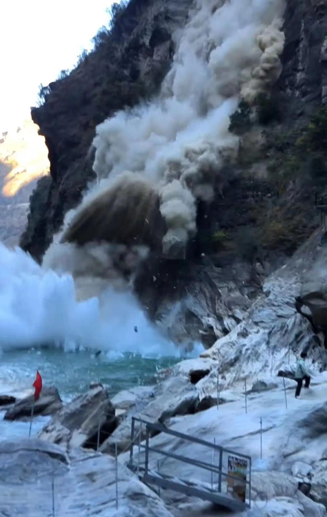 “山體滑坡,被我抓拍到了!巨浪襲來,像爆破了一樣……沒有砸到人,沒有傷亡,我們準(zhǔn)備撤退……”拍攝者聲稱,事發(fā)前不久他才從距離塌方點(diǎn)最近的觀景平臺(tái)離開,否則可能被碎石砸到。視頻畫面顯示,有多名游客正在有序撤離。