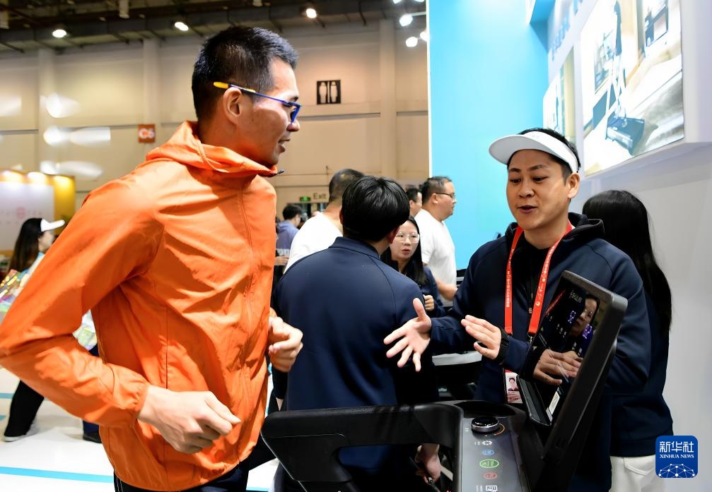 1月2日,參觀者在博覽會現場體驗智能跑步機。