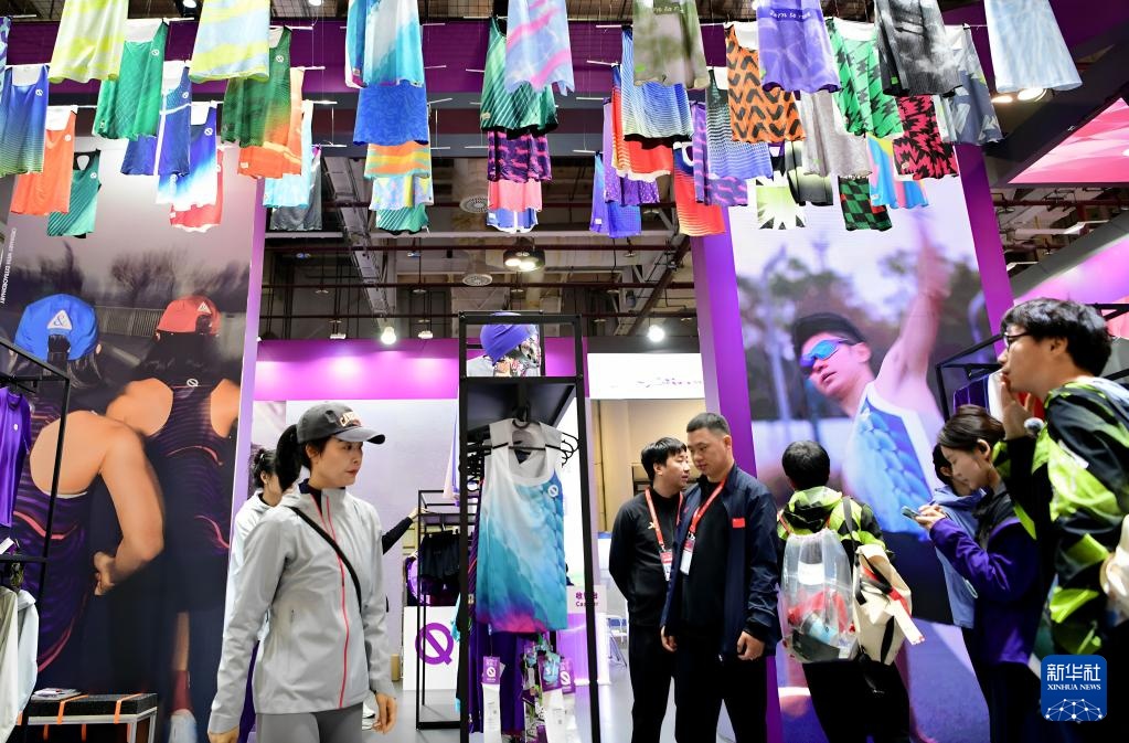 1月2日,觀眾在博覽會現場挑選體育運動服裝。