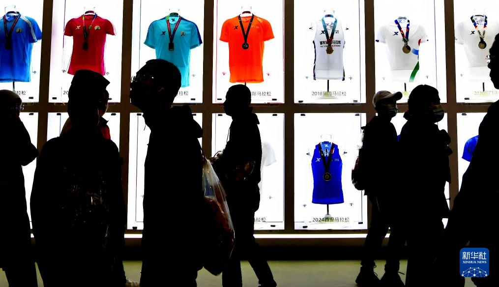 這是1月2日在博覽會現場拍攝的國內各地馬拉松賽事服裝展示櫥柜。