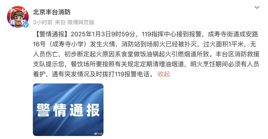 據@北京豐臺消防 ,2025年1月3日9時59分,119指揮中心接到報警,成壽寺街道成安路16號(成壽寺小學)發生火情,消防站到場前火已經被撲滅,過火面積1平米,無人員傷亡,初步斷定起火原因系食堂做飯油鍋起火引燃煙道所致。