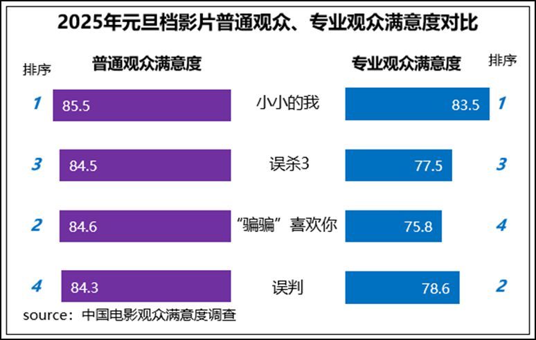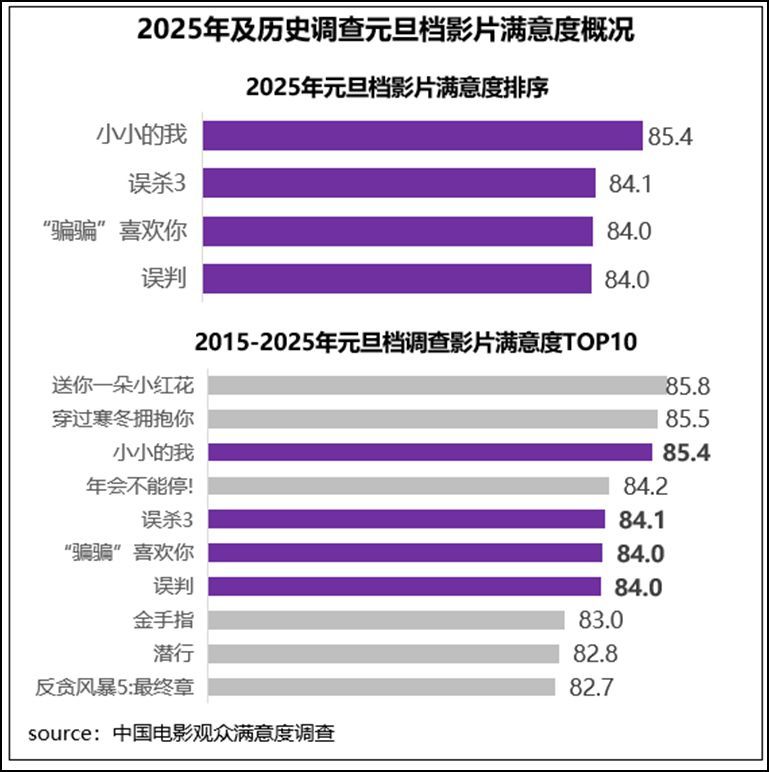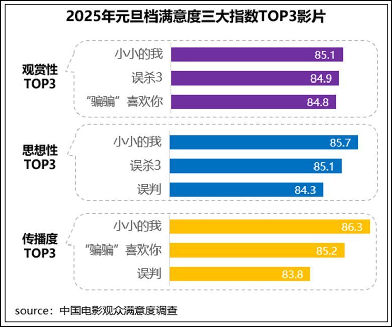 中國電影觀眾滿意度調查 2025年元旦檔調查結果顯示,元旦檔電影觀眾滿意度得分84.7分,同比增長1.7分,居2024年調查各檔期第二位。檔期影片類型和題材差異化,高質量特征進一步凸顯,主調查的四部影片滿意度均超84分,其中《小小的我》滿意度以85.4分領銜,《誤殺3》居第二位,《“騙騙”喜歡你》《誤判》以0.1的分差緊隨其后。