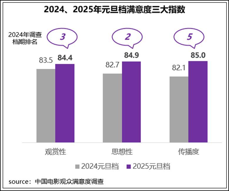 2025年元旦檔三大指數創作都獲得較高認可且表現較為均衡,觀賞性、思想性和傳播度指數分別為84.4分、84.9分和85.0分,其中檔期思想性居年內第二位、觀賞性居第三位。