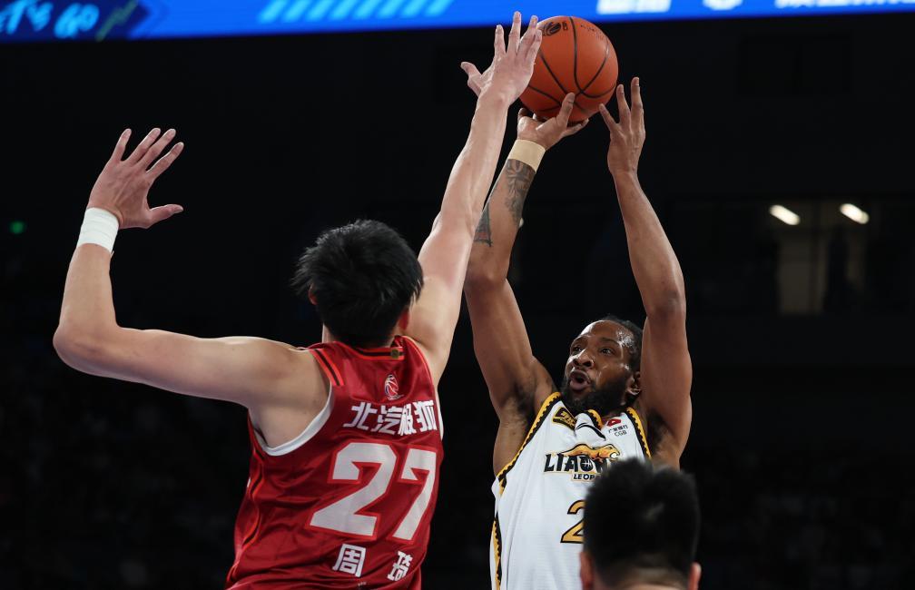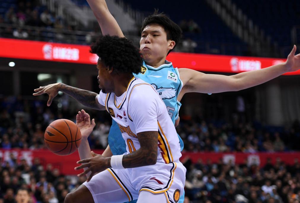 1月1日,遼寧隊球員威爾斯(右)在北京隊球員周琦的防守下投籃。新華社記者 王楷焱 攝
